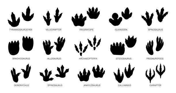 Dinosaur paw. Monster lizard footprint, dino black silhouette footstep. T-rex fossil feet icon, brachiosaurus paws shape. Paleontology. Wild animal. Vector set. Ancient creature traces