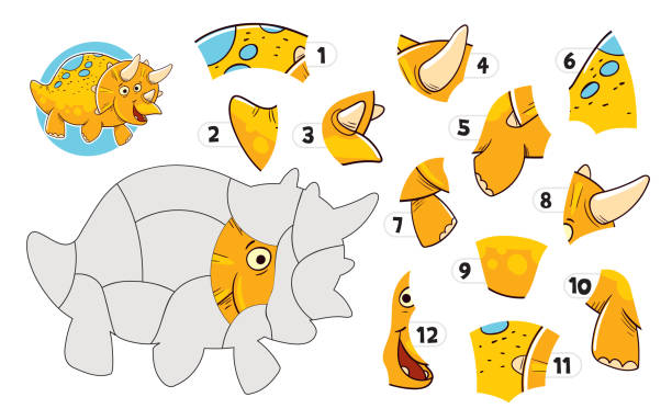 Jigsaw puzzle games. Puzzle with a dinosaur. Triceratops. Matching game. Educational game for children. Attention task. Find the missing piece of the picture. Colorful cartoon character